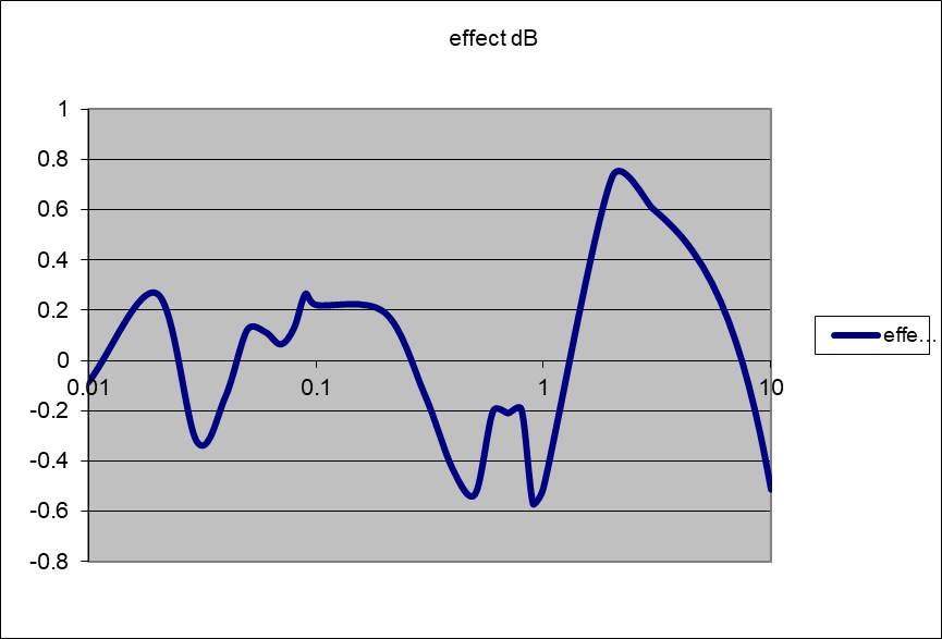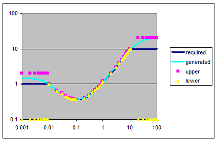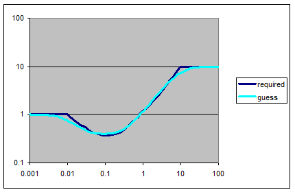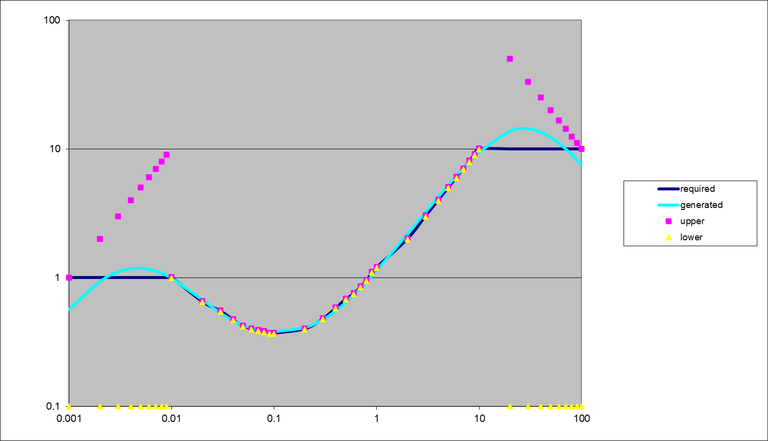 It’s not perfect; let’s get the spreadsheet to find us a better fit. We need response limits, and a measure for how far out the result is. We’ll use the “method of least squares”. For any point whose gain goes outside set limits, take the square of the relative gain error (1‑generated_gain/required_gain) at each frequency, and add ‘em all up.