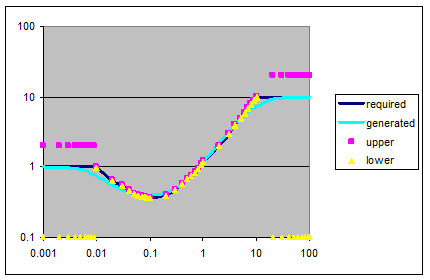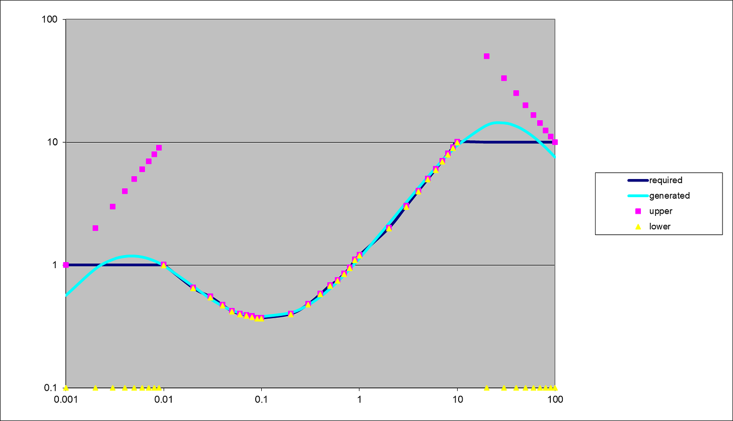 For the response limits shown in figure 5, I allowed 1% gain variation in the passband, and between (2x required) and 0.1 in the bands outside. If a response point lies between these limits, it doesn’t contribute to the error function.