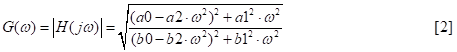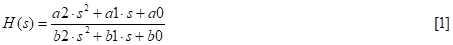Figure 2’s response is flat at one end, wavy in the middle and flat at the other end (with apologies to Monty Python); that’s a second order ‘shelf’ equalizer. The amplitude response of the general second order transfer function or ‘biquad’ section: