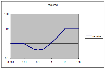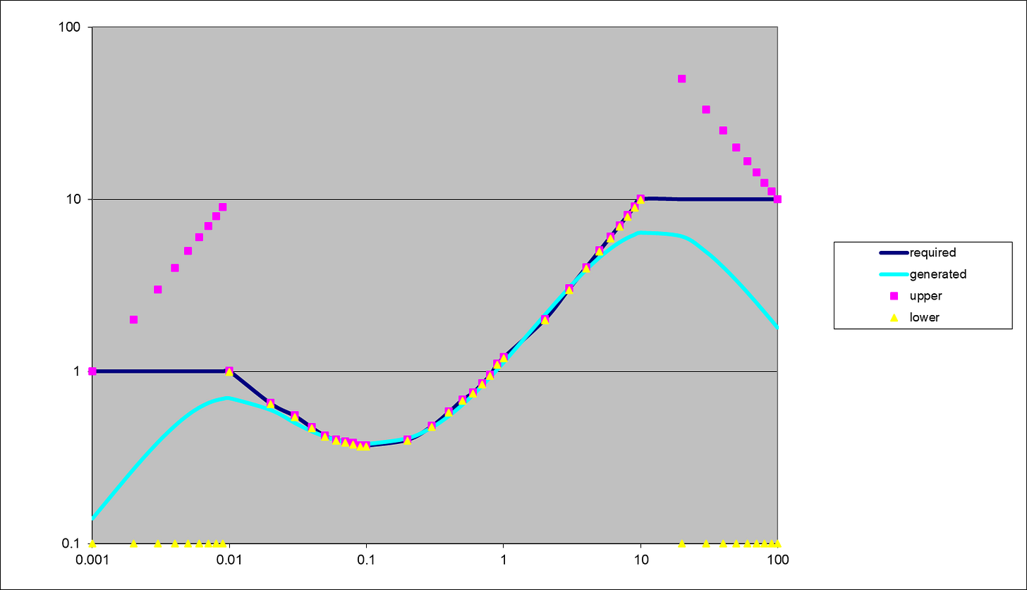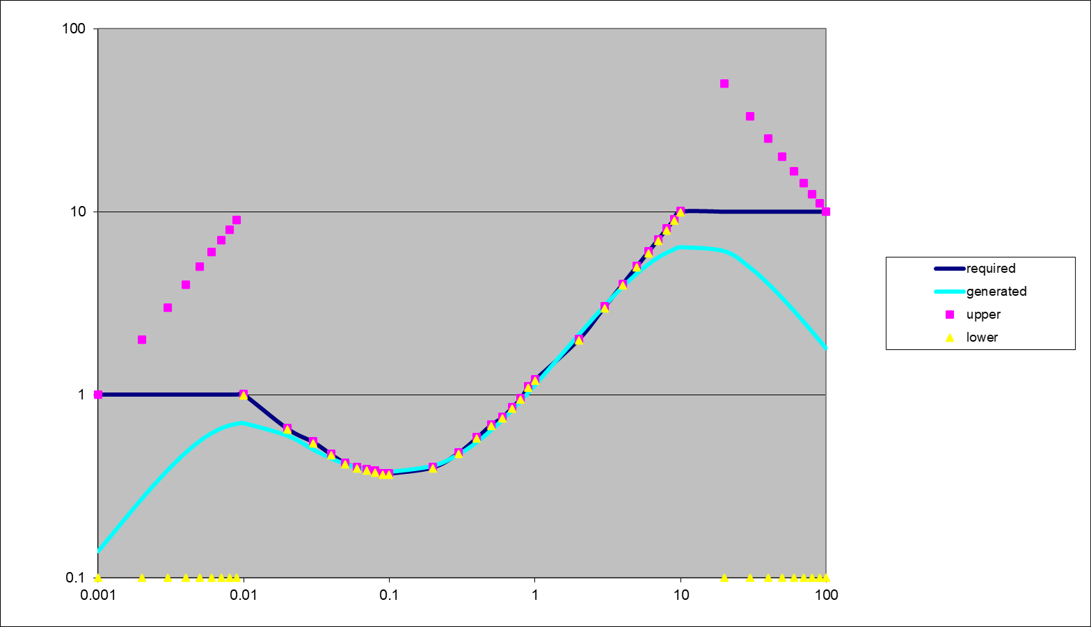 Now, I’ll wager that the response of that sensor continues to fall off at 20 dB/decade outside the graph limits. But it would be a terrible idea to boost the response with gain that continues to rise without limits. We’ll want the response to flatten off or even fall back down, to avoid noise problems. For a first try, let’s hold constant the desired response outside figure 1’s frequency range, for one extra decade in each direction; figure 2: