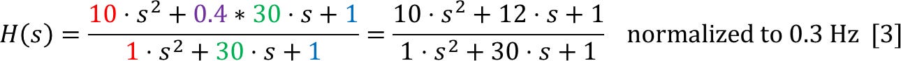 4 we need a guess at the dissipation, which is the reciprocal of the ‘Q’ of the denominator, and sets the denominator s1 term. The filter covers a frequency range of about 1000:1. My guess is the square root of this, say 30.