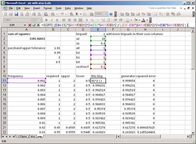 Figure 3 is a clippet of a working spreadsheet, using one column for each biquad section, with the cell formula shown in glorious ‘Excelcolor’. The gains of all the sections used are multiplied up (linear gains, not dB) and deposited in column G: