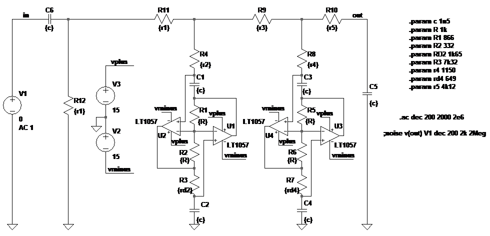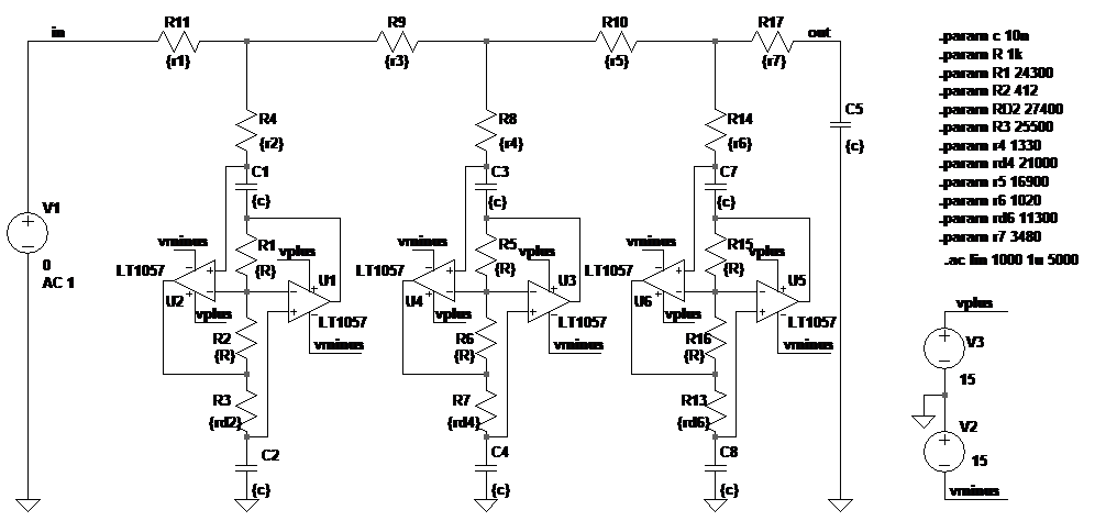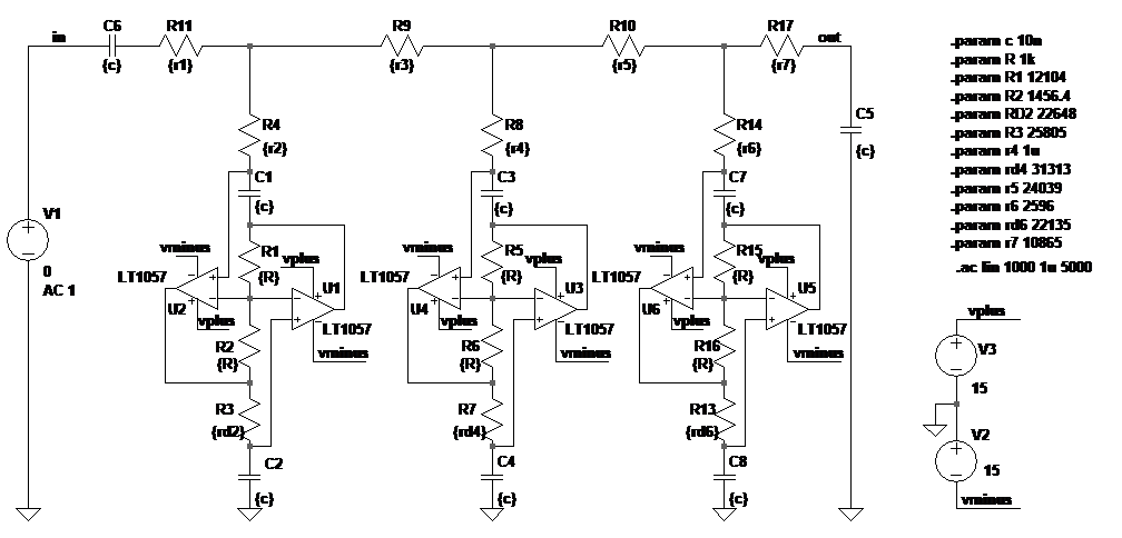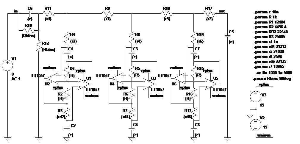 The sharp-eyed will notice that the ‘bias’ resistor is set to have the same value as the first filter network resistor. This Monkey-twist just reduced the number of different precision resistors in the design.