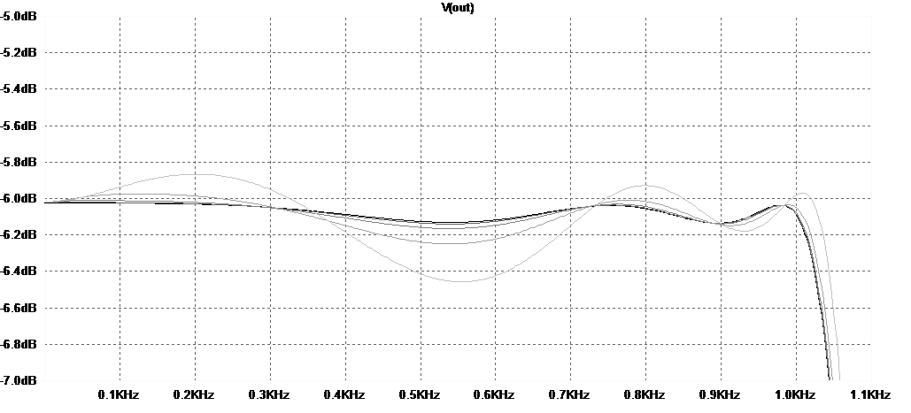 Figure 3 shows what happens to the passband response as we sweep the bias resistor value from 10Meg down to 100k. The traces for 300k and 100k show significantly degraded ripple but all the others are pretty close. The stopband (not shown) is hardly affected by the addition of the resistors.