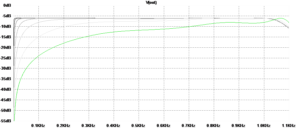 To achieve figure 4 I just left out the resistor across CS, and the lower sweep limit for the remaining resistor has been reduced to 10kohm (the very soggy green trace). It’s not a very good way of making a useful bandpass filter with an accurately flat passband, as the plot shows.